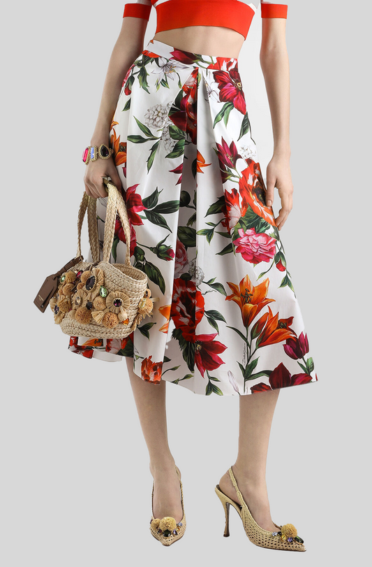 FLOWER PRINT PLEATED POPLIN SKIRT