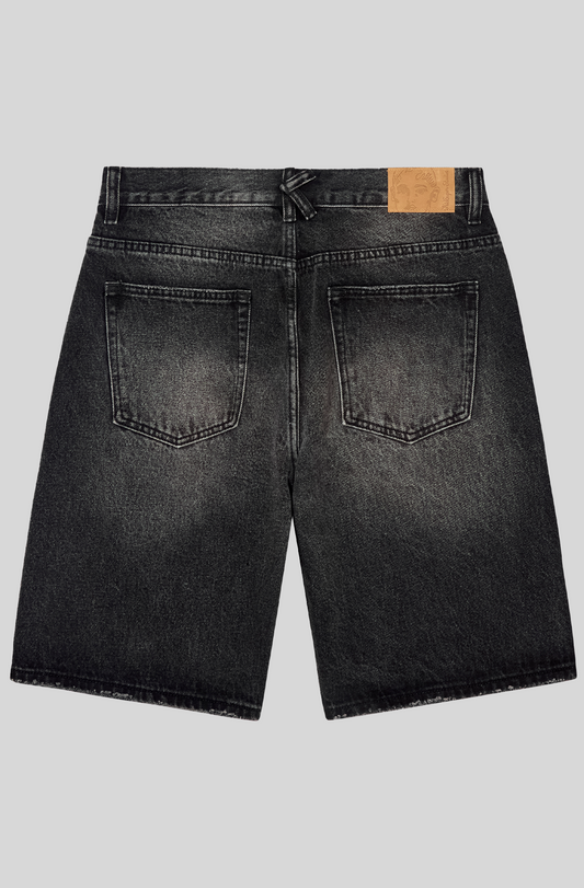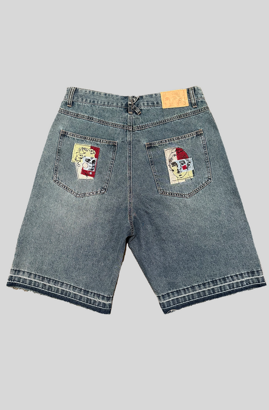 PATCHWORK FACE BAGGY DENIM SHORTS