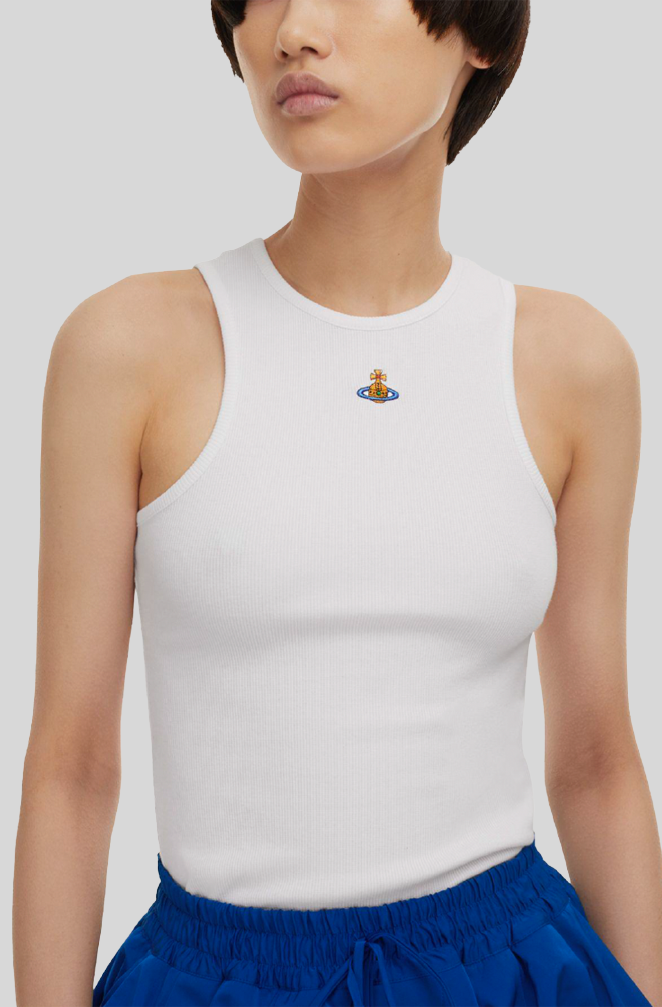 The 90s Vest top in White by Vivienne Westwood is a high neck singlet tank. Crafted from ribbed cotton, featuring an embroidered orb logo in the centre chest.