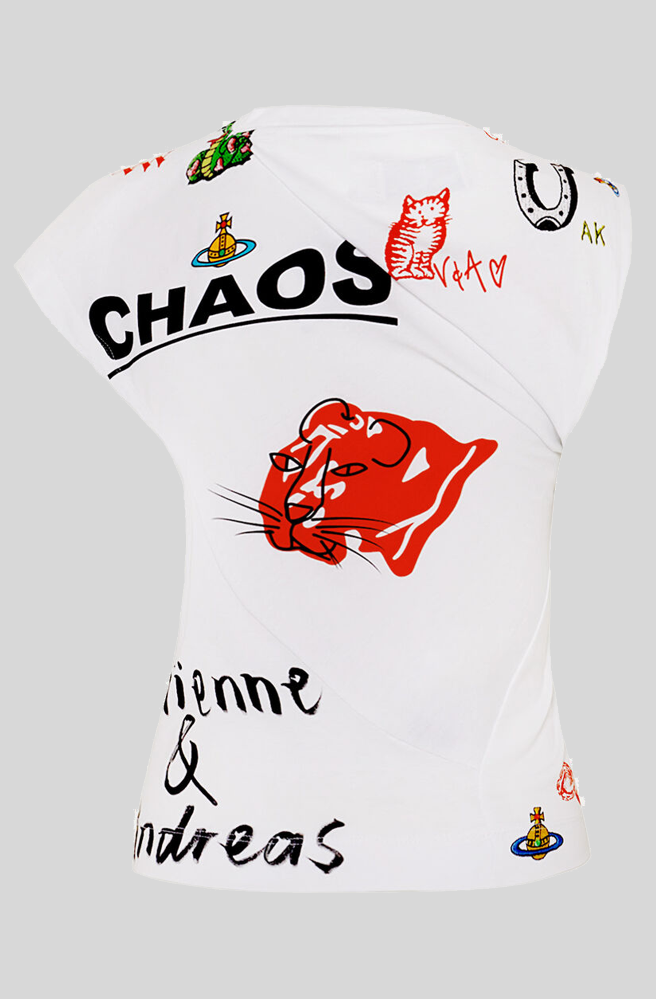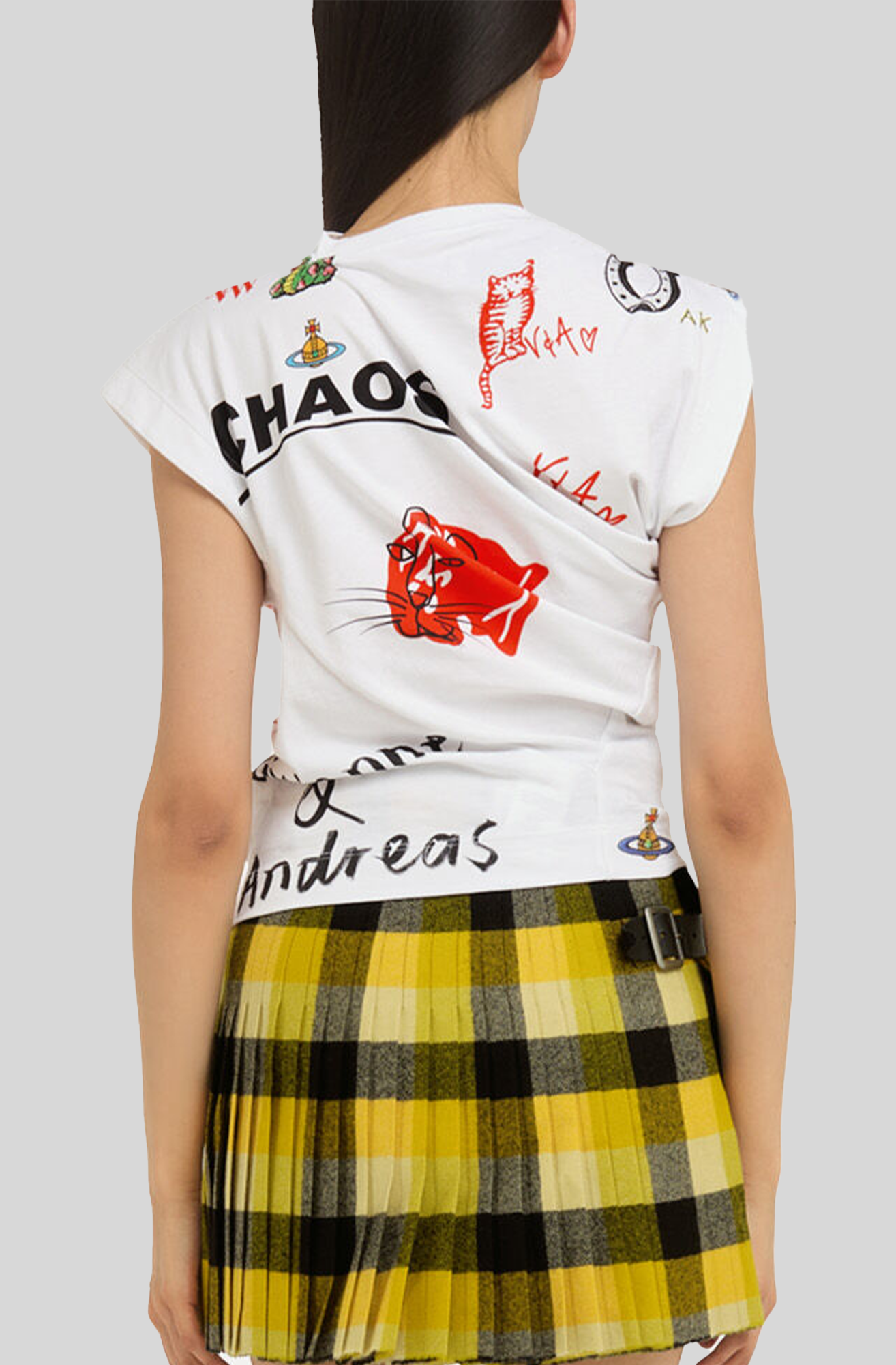 The Hebo Patches top in White by Vivienne Westwood features a draped silhouette. Cut from a printed cotton featuring signature iconography patches.