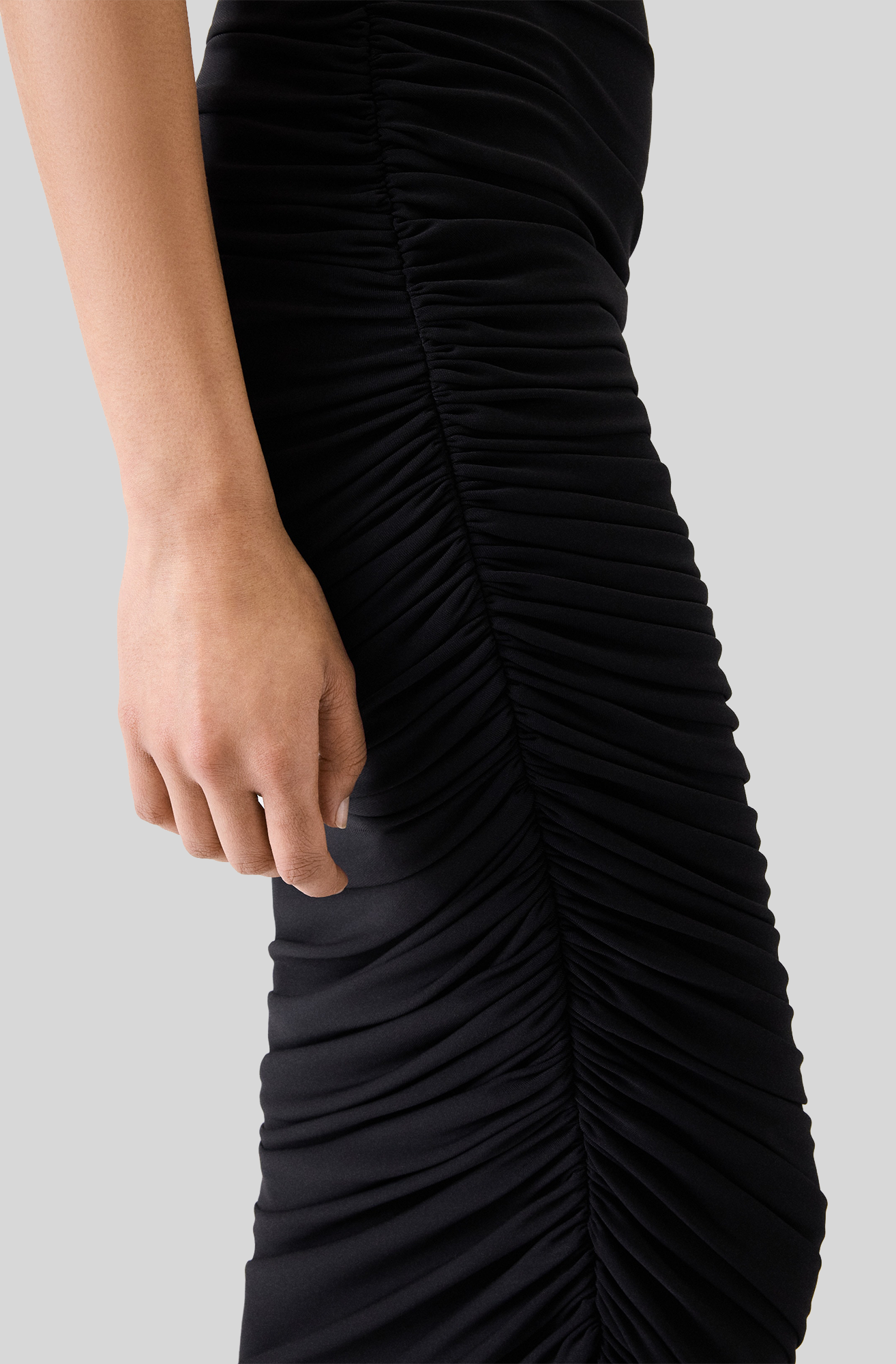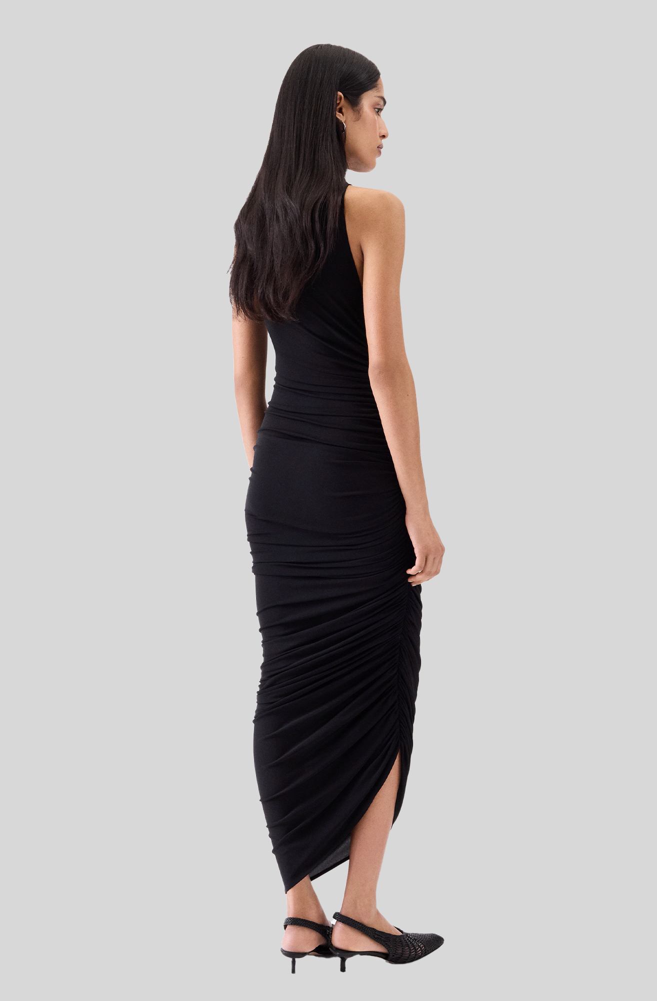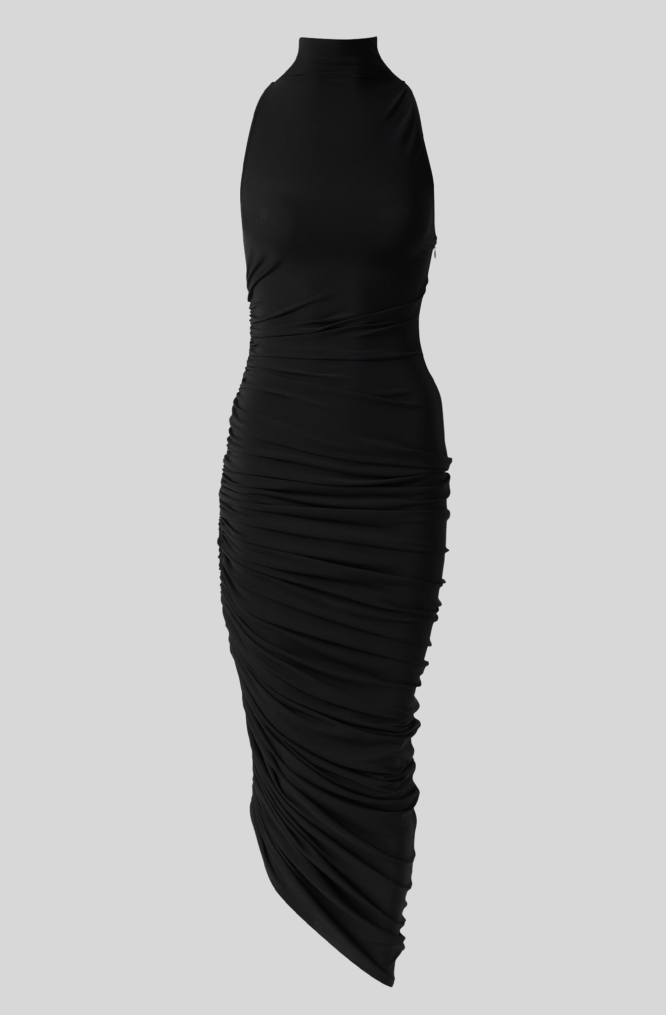 La Robe Piazza in Black by Jacquemus is cut from a fluid, soft stretch jersey. Featuring an asymmetric silhouette, this sleeveless dress has an integrated turtleneck, gathered draping at the side seams, a side zipper, buttoned keyhole closure at back and a below the knee hem.