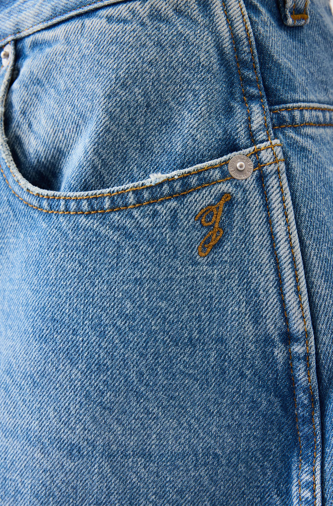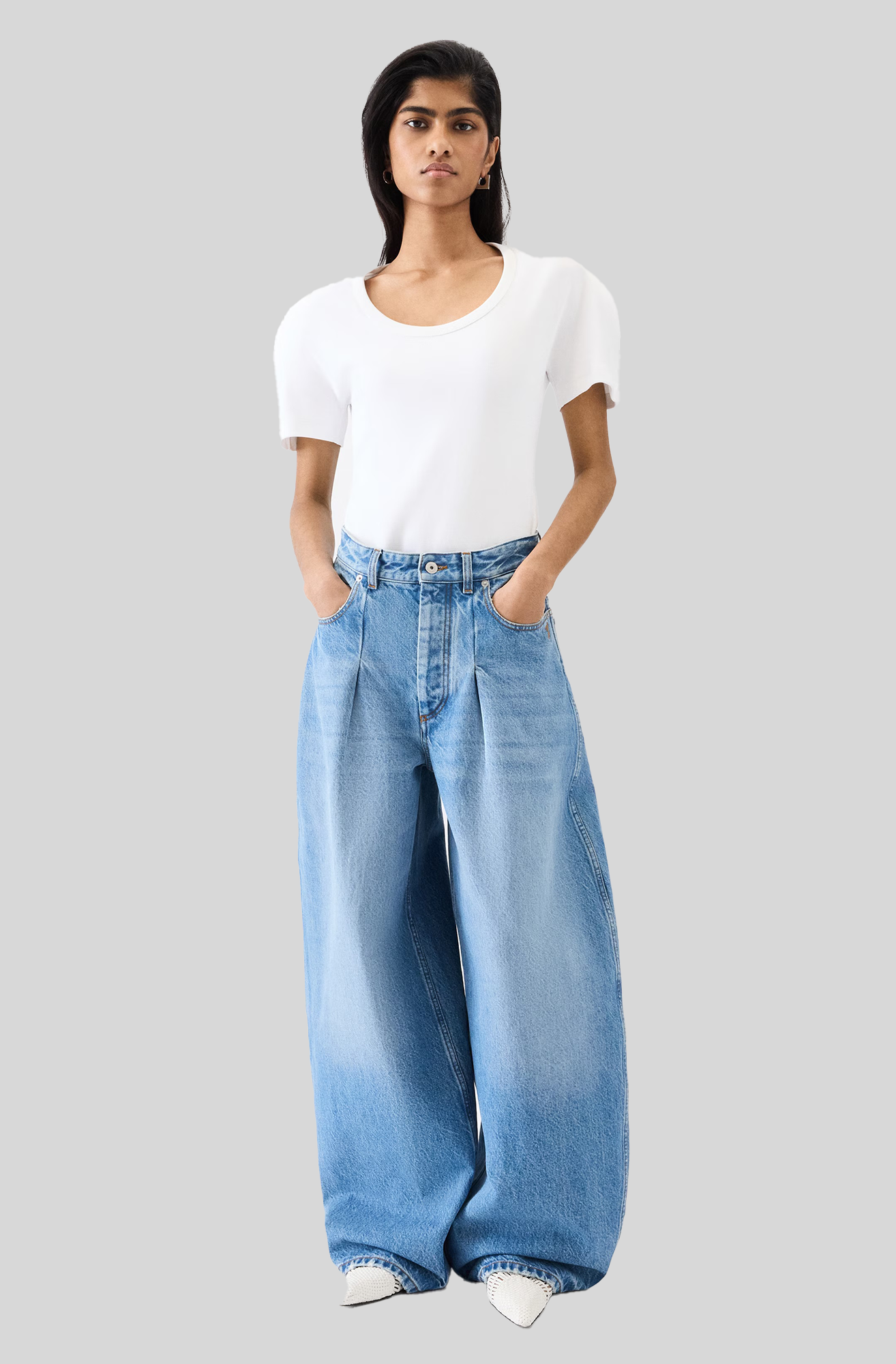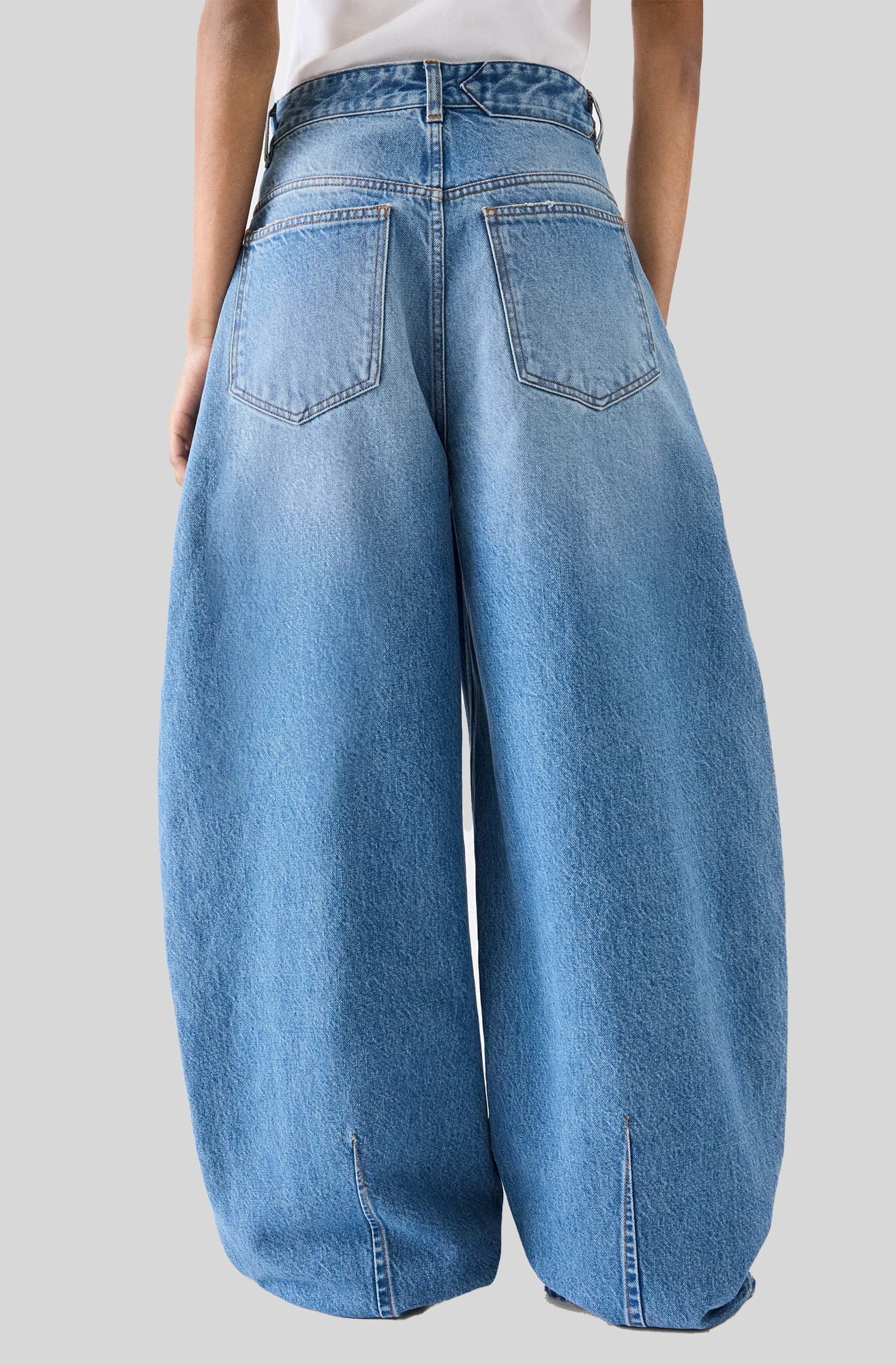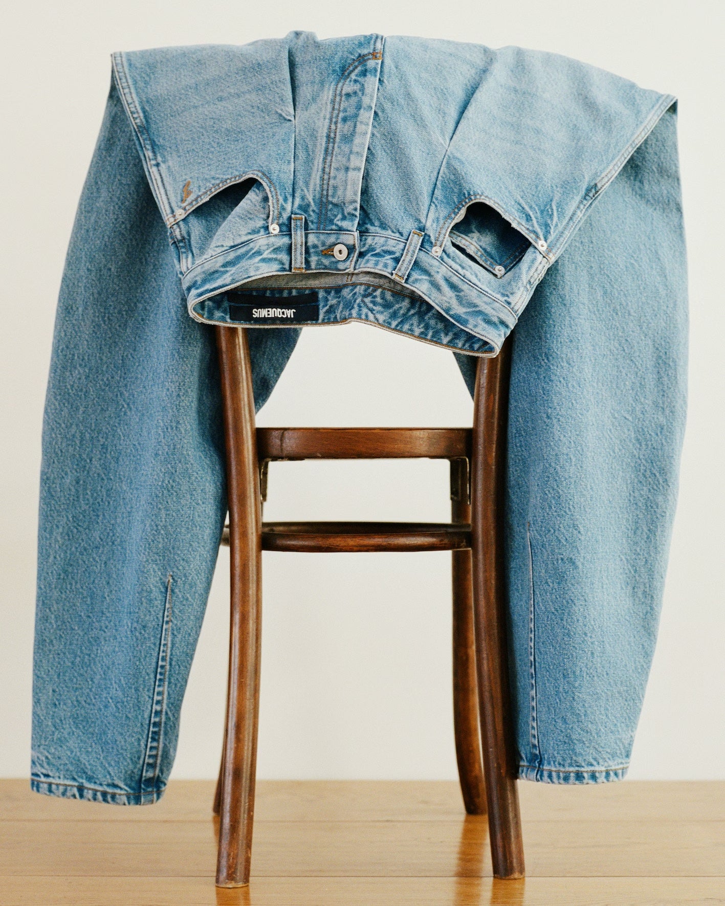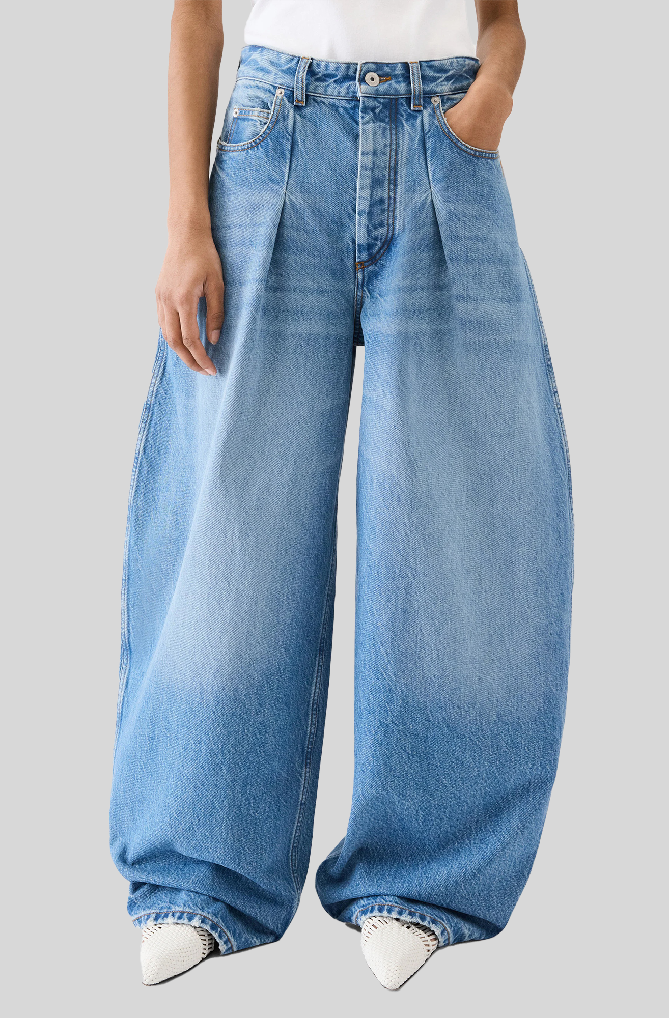 Le De Nimes in Blue Denim by Jacquemus is cut with a structured barrel shape. This indigo jean is designed to sit high waisted, and hold its structured curve silhouette.