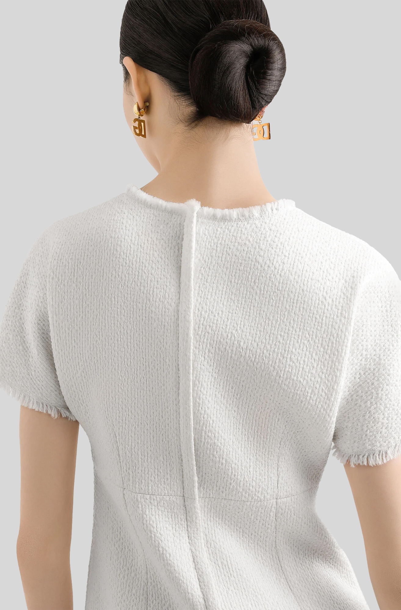 The Raschel Tweed Midi Dress with DG Logo by Dolce and Gabbana features a sheath silhouette. Cut from a wool blend raschel tweed, this dress features a round neckline, short sleeves, waist darting, a gold-toned DG charm logo at the waist, and a just above-the-knee hemline.