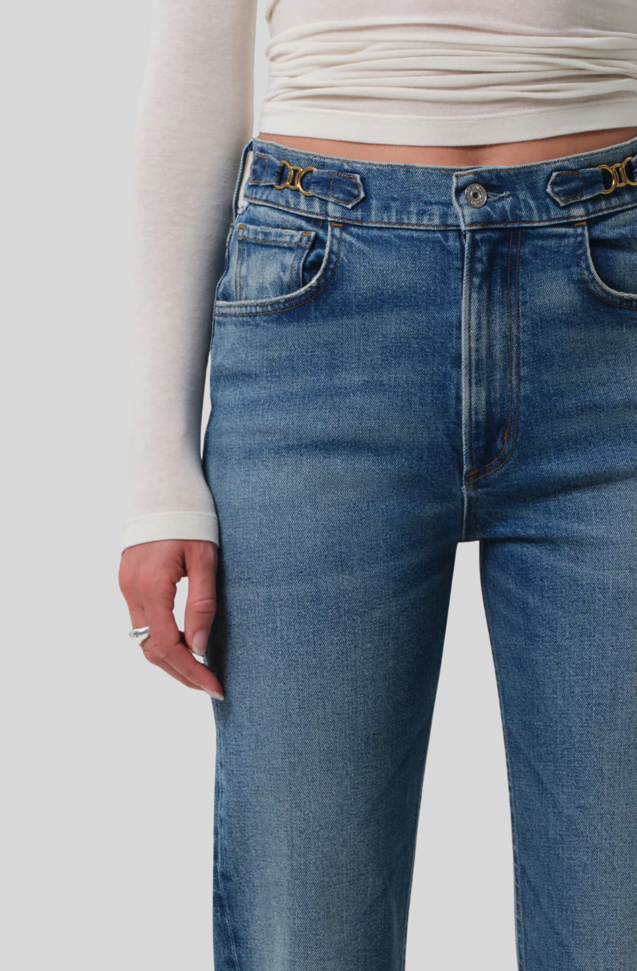Looks Like: Medium indigo blue denim with horsebit waistband detailing