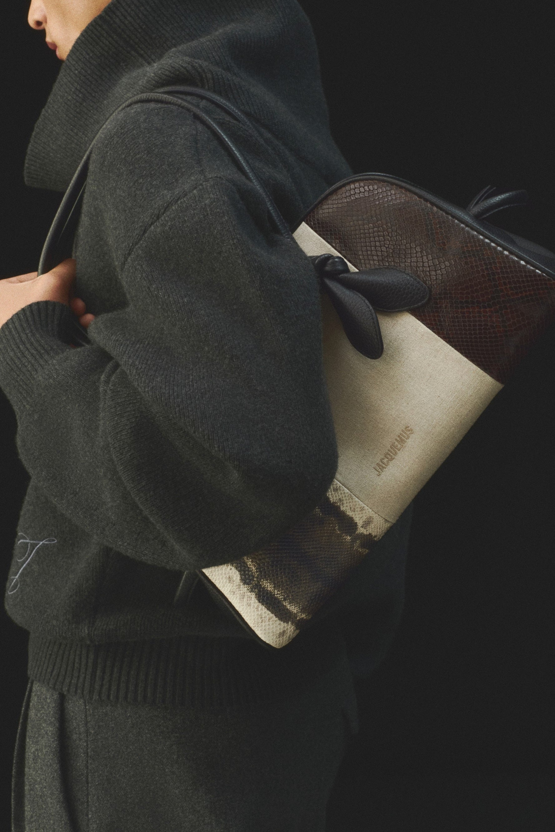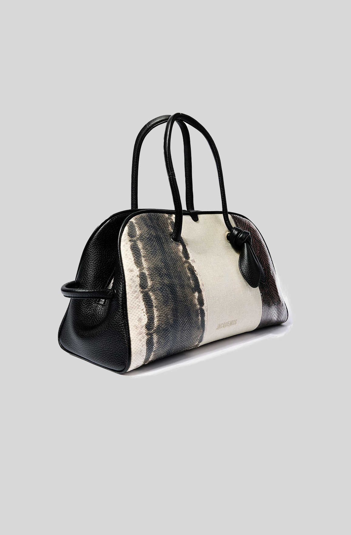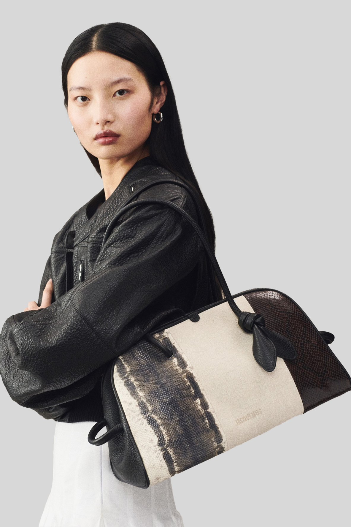 Le Turismo in multi beige and brown by Jacquemus is a soft, luxe bowling-style bag crafted from linen and embossed-leather patchwork, trimmed with grained calf leather for an elevated finish. Featuring a double-sided zipper, tubular handles knotted for a relaxed touch, and an interior pocket, it’s spacious enough to carry your essentials with effortless elegance. Made in Italy, this piece offers a refined blend of artisanal detail and everyday versatility.