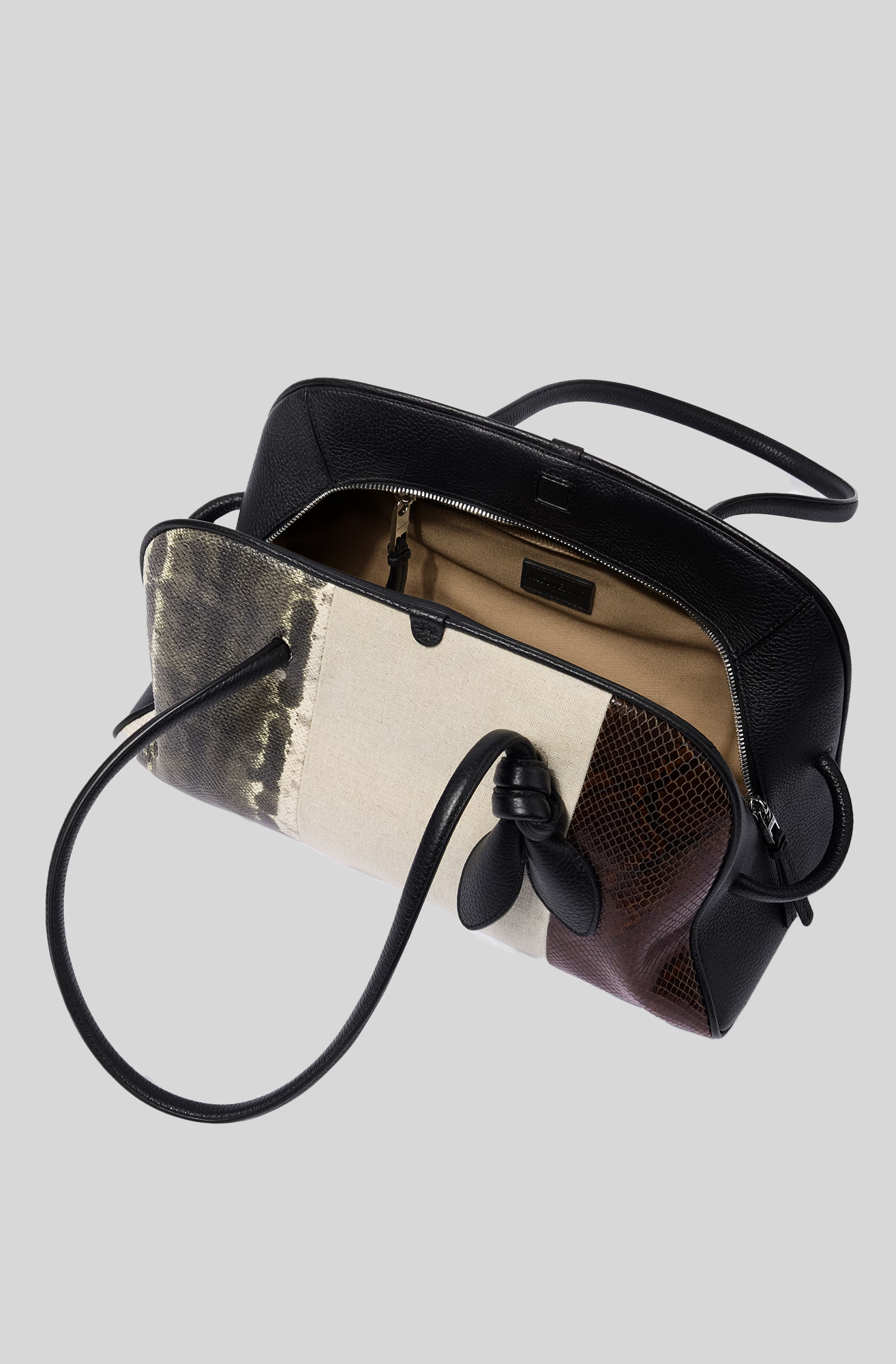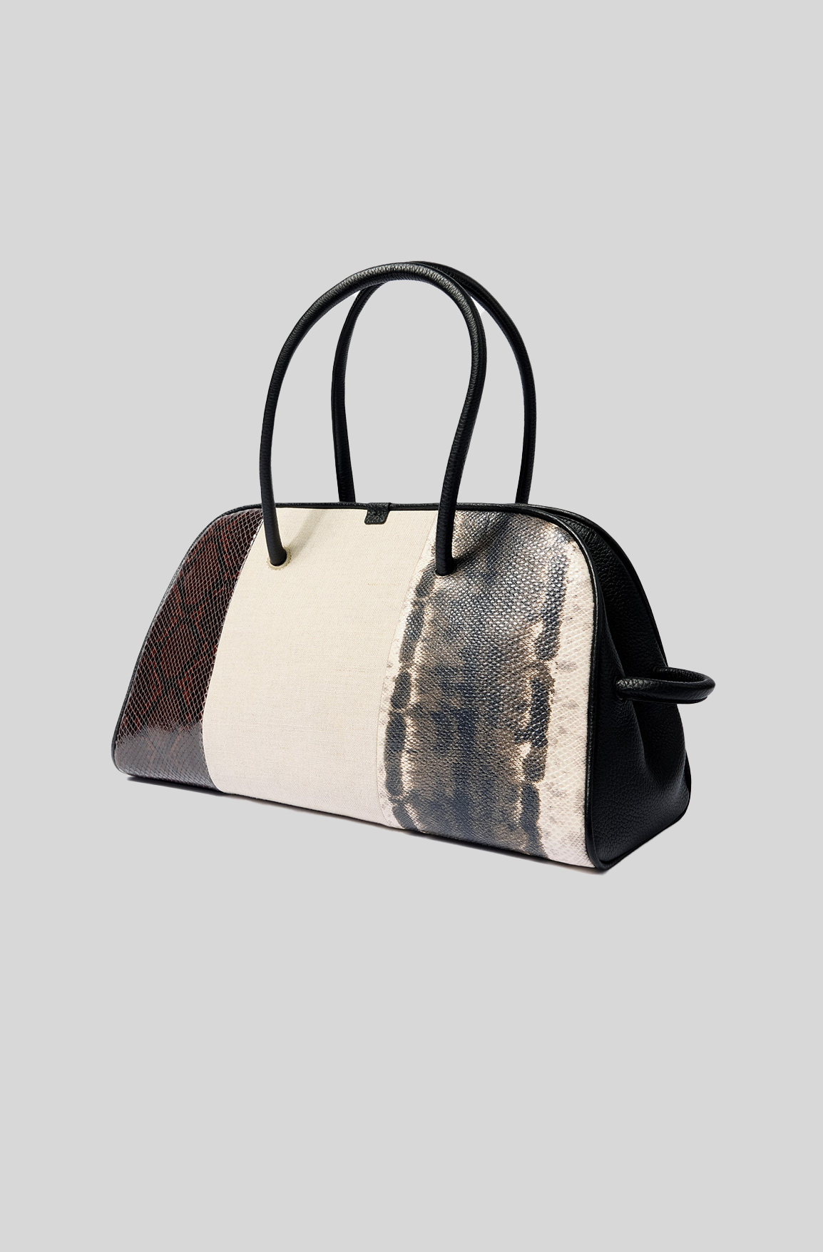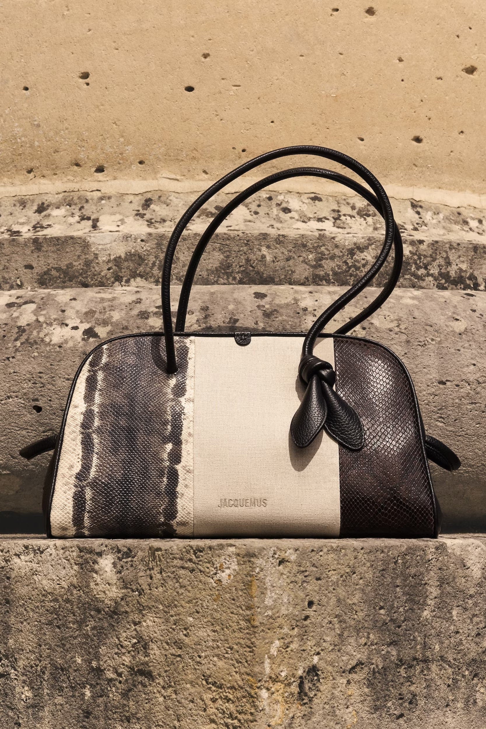 Le Turismo in multi beige and brown by Jacquemus is a soft, luxe bowling-style bag crafted from linen and embossed-leather patchwork, trimmed with grained calf leather for an elevated finish. Featuring a double-sided zipper, tubular handles knotted for a relaxed touch, and an interior pocket, it’s spacious enough to carry your essentials with effortless elegance. Made in Italy, this piece offers a refined blend of artisanal detail and everyday versatility.