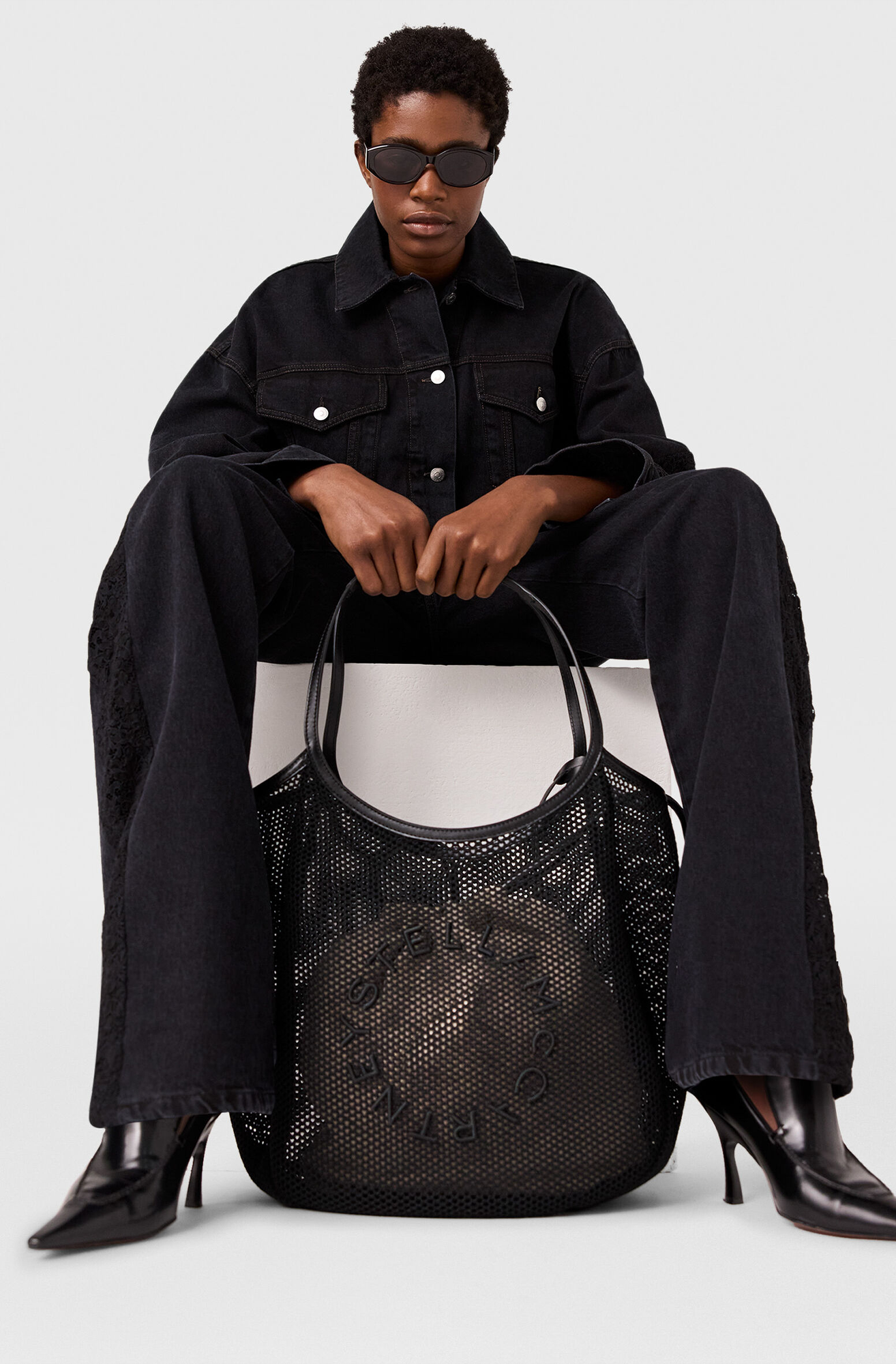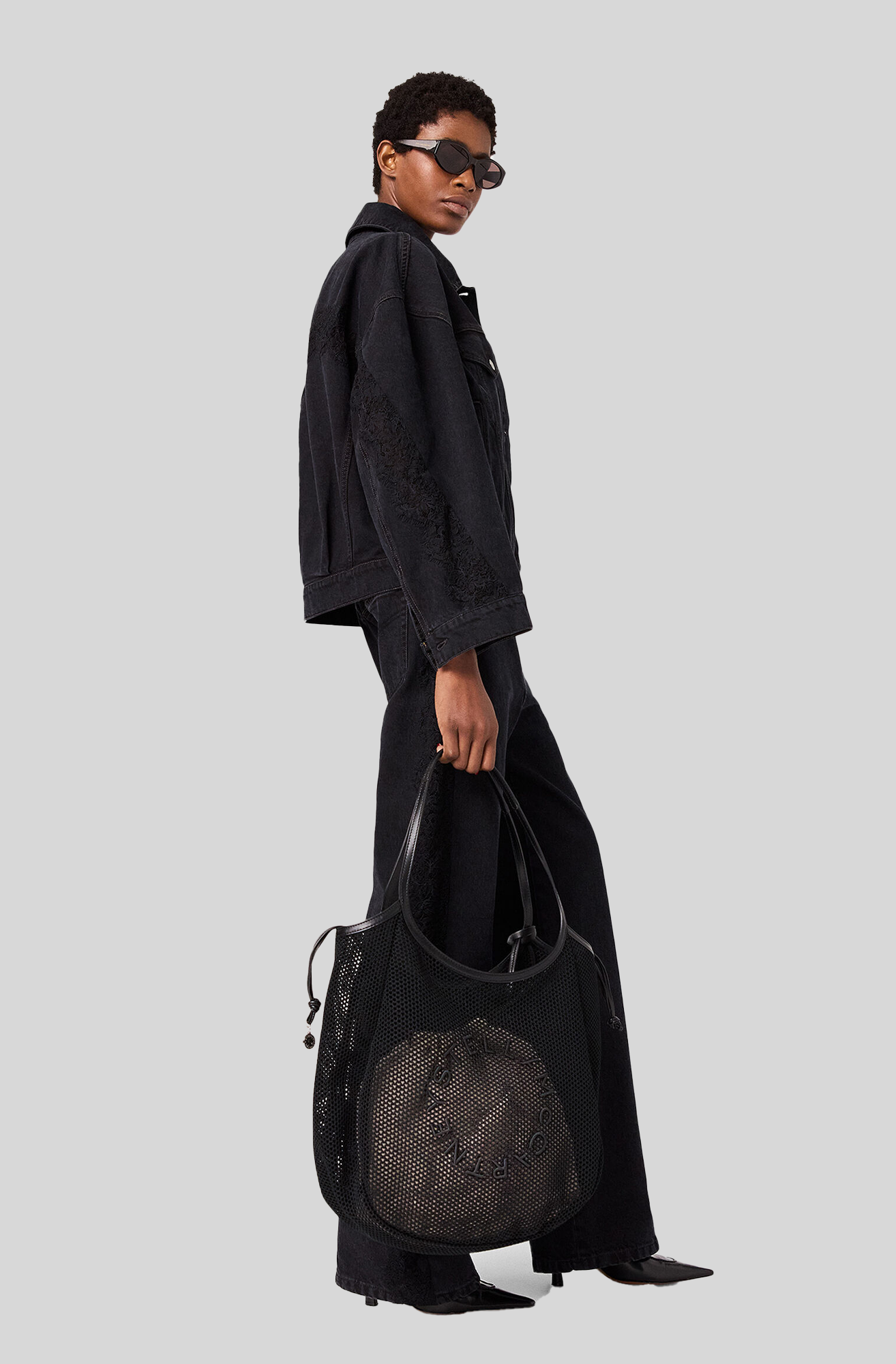 The Lace Panelled Denim Jacket in Black by Stella McCartney is crafted from organic cotton denim. Featuring a boxy silhouette this piece has a lace inserts on the sleeves, a pointed collar, button down front, structural seam details and distressed trims.
