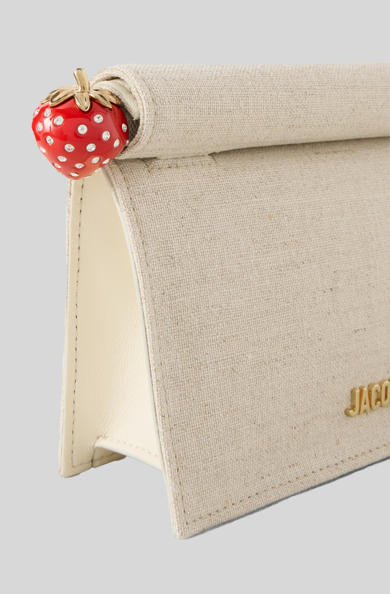Refined yet playful, La Petit Pochette Rond Carre captures the essence of Jacquemus minimalism with a twist. Crafted in Italy from durable beige canvas, this fold-over clutch features the signature gold-tone logo and a whimsical strawberry charm. A nod to the designer’s sun-kissed Mediterranean spirit. The bag includes a magnetic closure, internal slot pocket, and a detachable 114 cm chain strap, giving you the option to wear it cross-body or style it as a chic handheld piece.