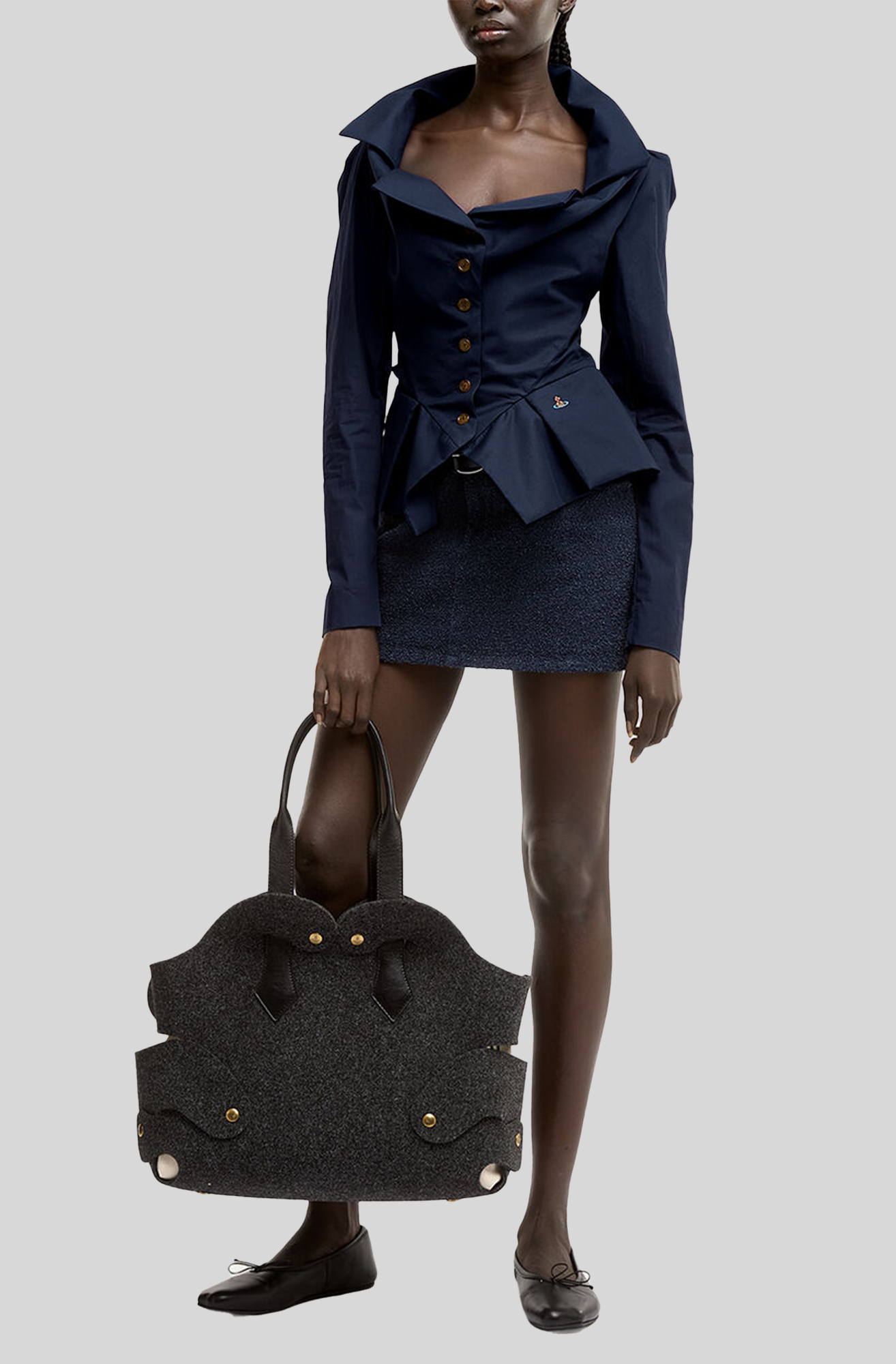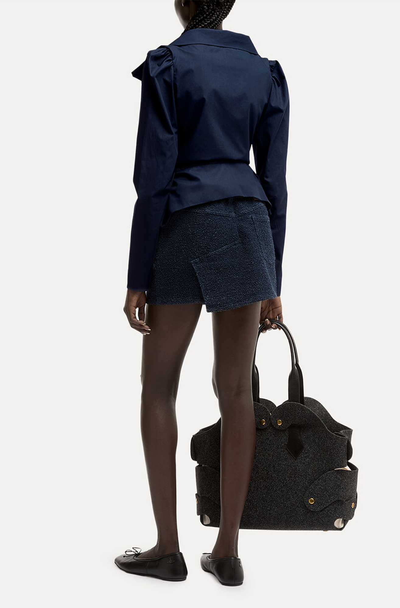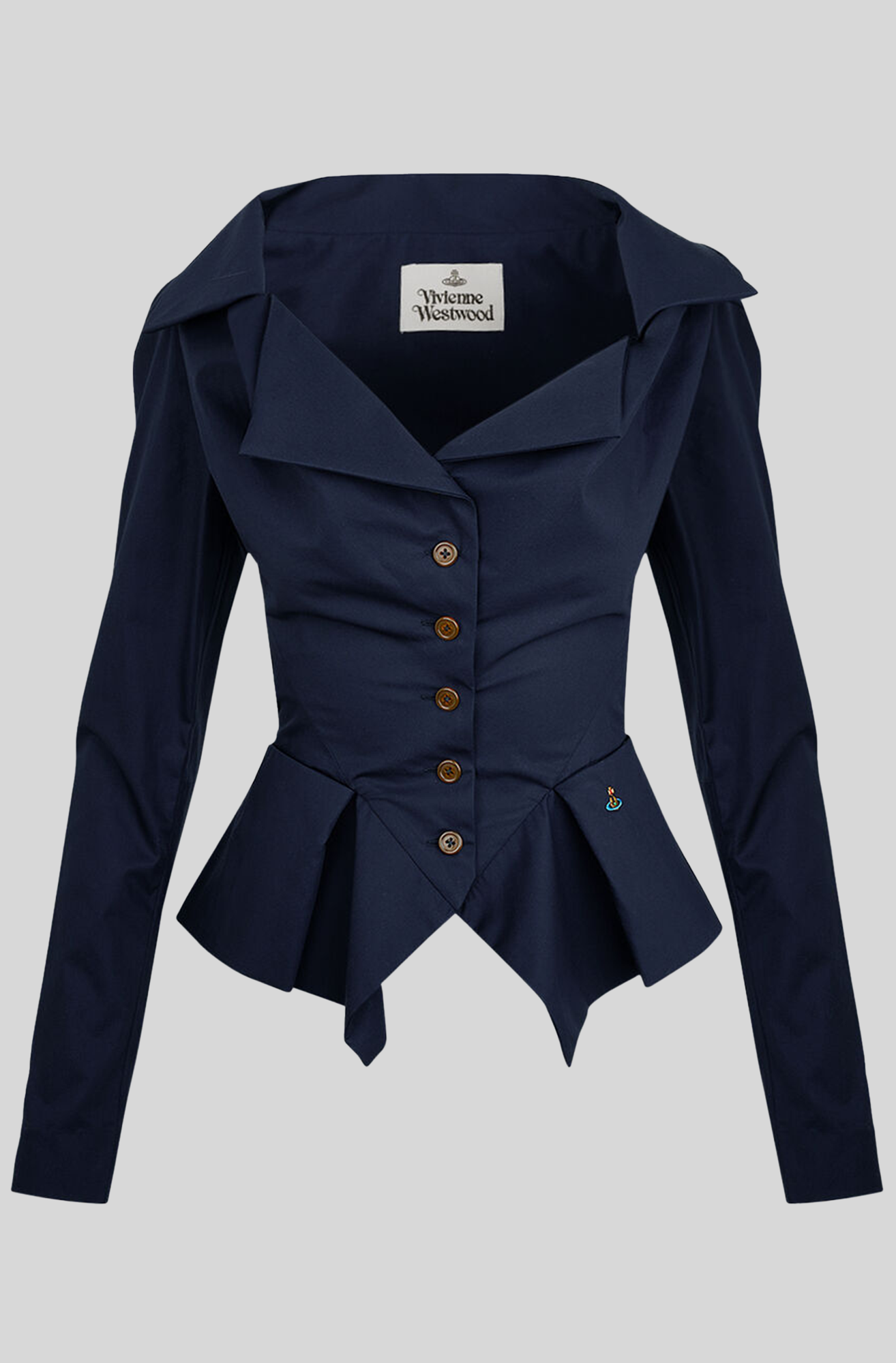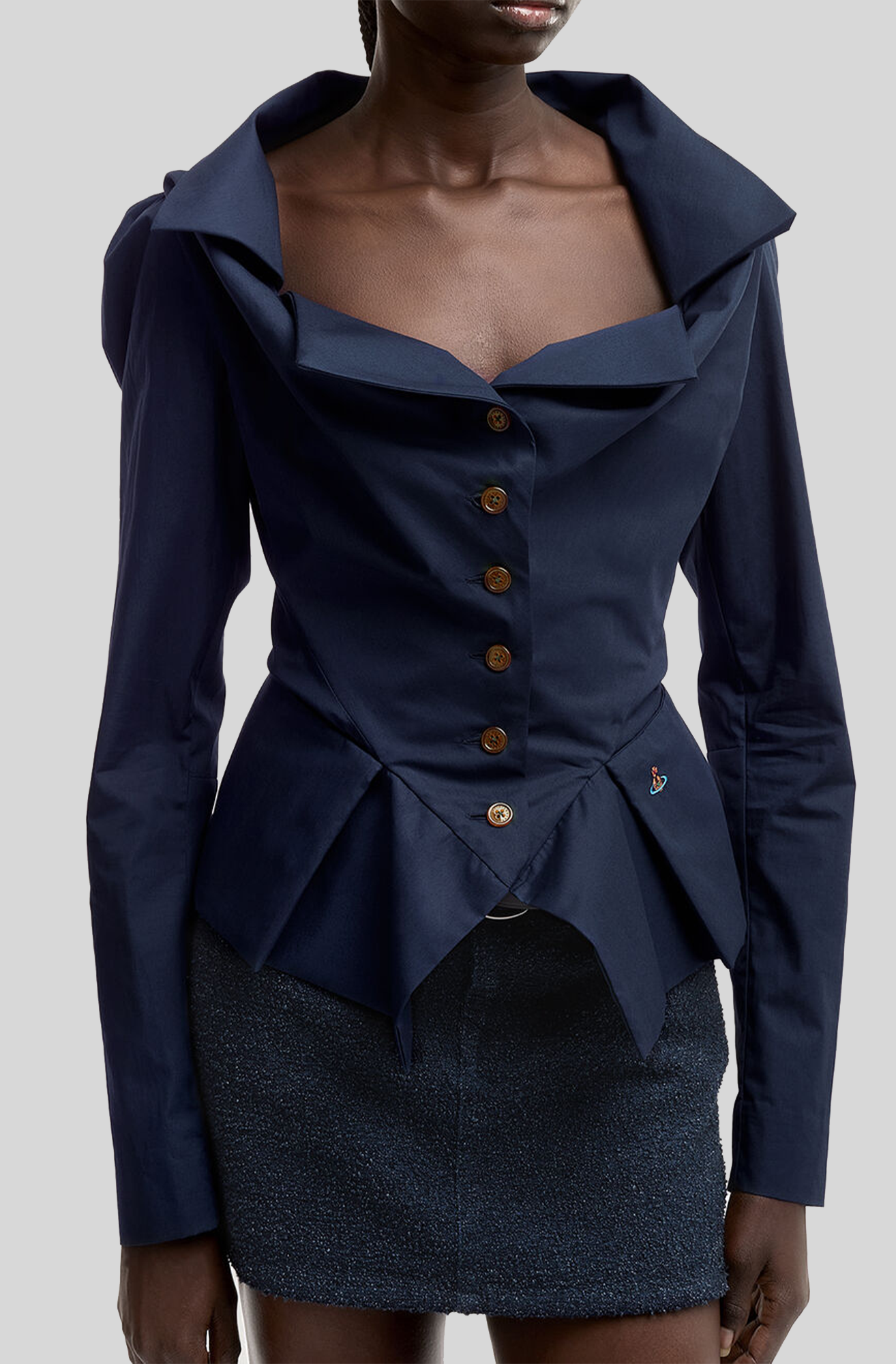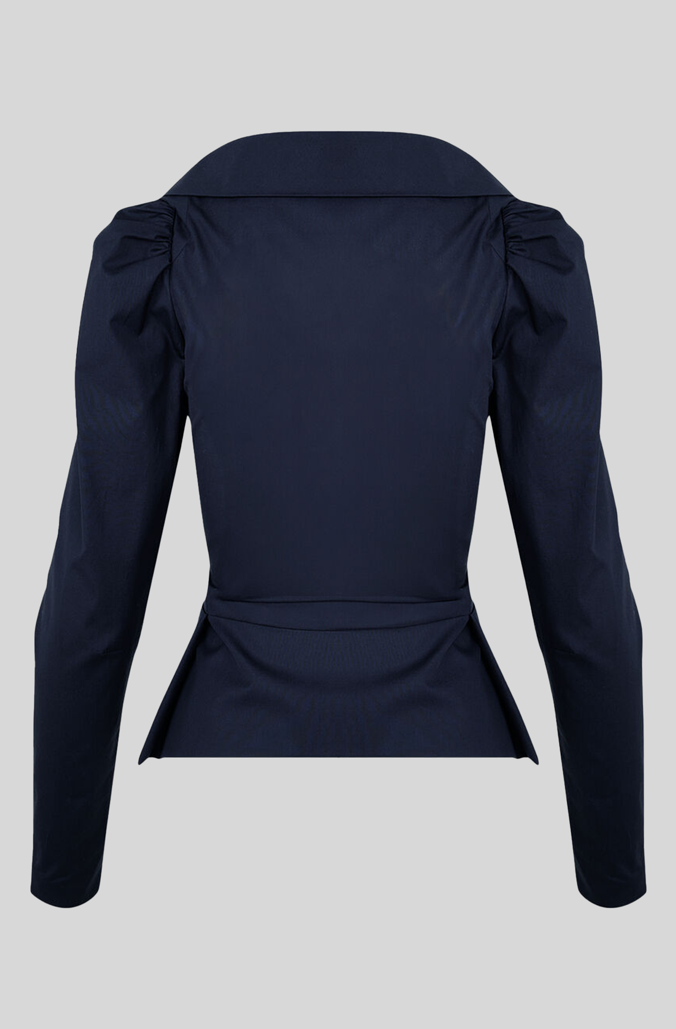 The Monday Shirt in the Navy by Vivienne Westwood is cut from an Organic Cotton fabrication. Featuring origami-like folds of fabric around the neckline, letter-engraved button fastenings, embroidered orb motif at hip, fitted bodice with flared/ peplum pleated fabric extending from the waist, finished with elegantly puffed shoulders and long sleeves.
