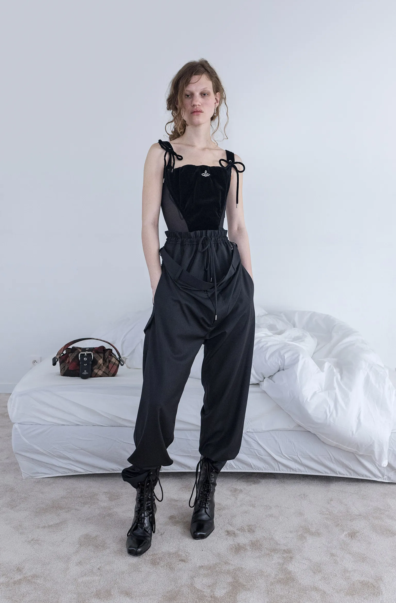 The Puppy Corset in Black by Vivienne Westwood is crafted in a black velvet colour way making it a classic Vivienne Westwood piece, defined by its cinched waist and gently curved square neckline - referencing historic 18th-century corsetry. The design is finished with a three-dimensional orb zip, evoking Vivienne’s vision of taking tradition into the future.