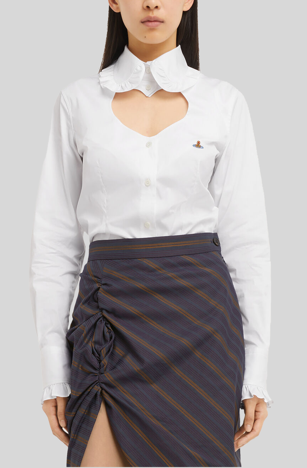 The Toulouse Frill Shirt in the White by Vivienne Westwood is revives the archival cut-out heart tailoring at the neckline - synonymous with Vivienne's affection for both humanity and the planet. The piece is finished with the signature orb embroidery at the chest, complete with a delicately rounded collar, framed with gathered frill detailing.